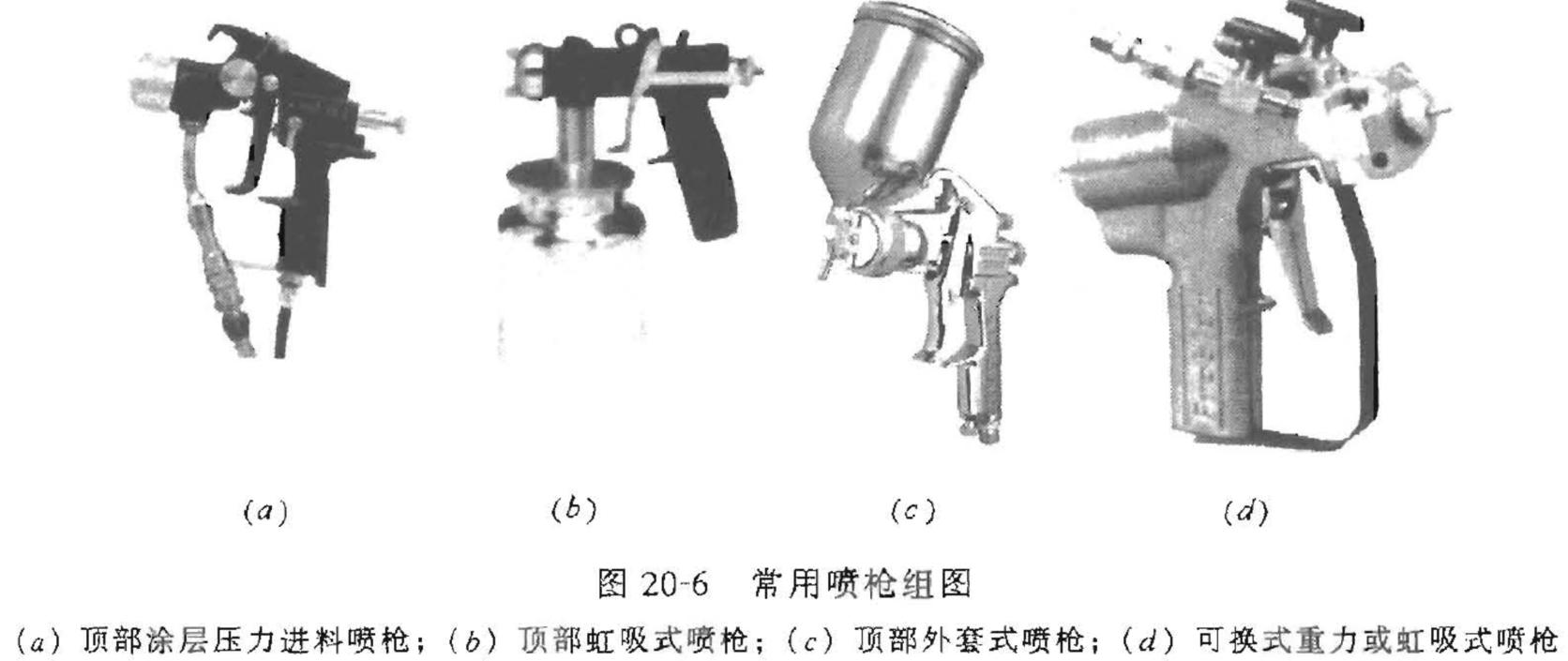 6.噴涂施工應(yīng)按自上而下,先噴垂直面后噴水平面的順序進行。噴槍與基層表面應(yīng)接近垂直,噴嘴與被噴面的距離一般為250~500mm。噴槍沿一個方向來回移動,使霧流與前一次噴涂面重合一半。噴槍移動要求速度均勻,以保證涂層厚度一致,噴涂時應(yīng)注意涂層不應(yīng)過厚,以防止流淌或溶劑揮發(fā)不完全而產(chǎn)生氣泡,同時應(yīng)使空氣壓力均勻一致(一般為O.3~0.6MPa)。大面積施工時,可采用高壓噴涂,其壓力一般在1MPa以上。見圖20-7。噴涂完畢后要及時用有機溶劑清洗噴涂用具,涂料要加蓋封嚴,一切工具和容器禁止與水接觸。