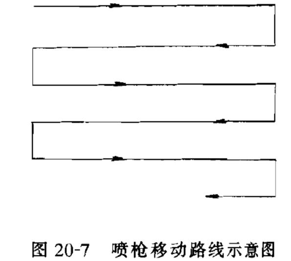 6.噴涂施工應(yīng)按自上而下,先噴垂直面后噴水平面的順序進行。噴槍與基層表面應(yīng)接近垂直,噴嘴與被噴面的距離一般為250~500mm。噴槍沿一個方向來回移動,使霧流與前一次噴涂面重合一半。噴槍移動要求速度均勻,以保證涂層厚度一致,噴涂時應(yīng)注意涂層不應(yīng)過厚,以防止流淌或溶劑揮發(fā)不完全而產(chǎn)生氣泡,同時應(yīng)使空氣壓力均勻一致(一般為O.3~0.6MPa)。大面積施工時,可采用高壓噴涂,其壓力一般在1MPa以上。見圖20-7。